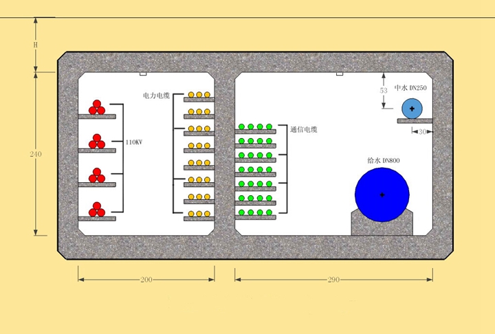 綜合管廊沿濟(jì)南奧林匹克體育中心的奧體西路、奧體北路和龍洞路敷設(shè),全長(zhǎng)約4公里。納入管線有給水、中水、通信、電力管線。